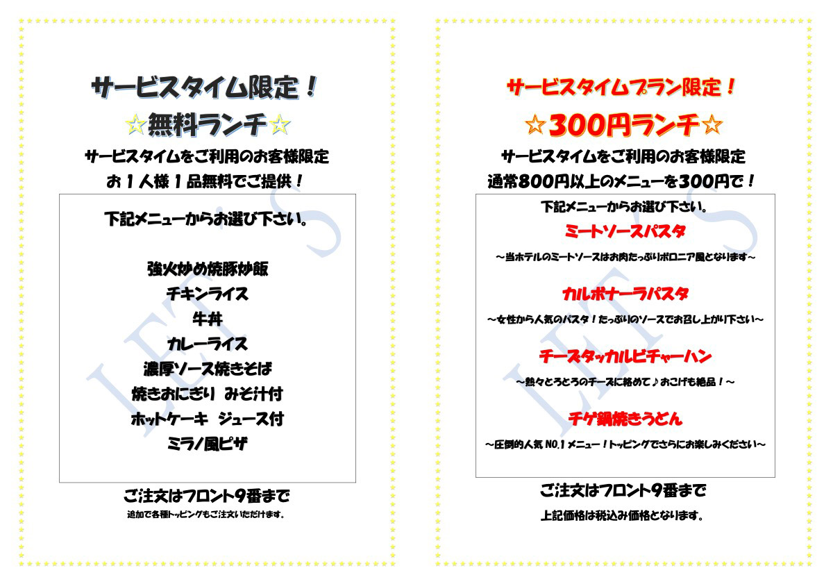 | サービスタイム(フリータイム)5:00~17:00の間 | ¥5,000 | ¥6,500 |